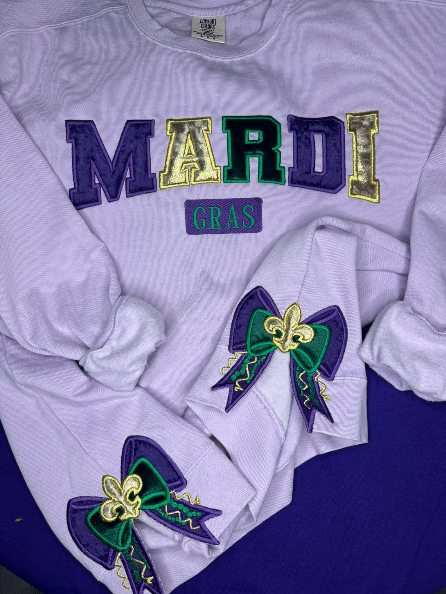 The Mardi Gras Applique option includes a sweatshirt with bows on the sides to accent the hip area. This is a detailed embroidery applique. This is also available without bows.